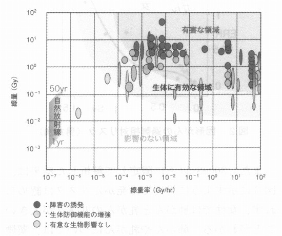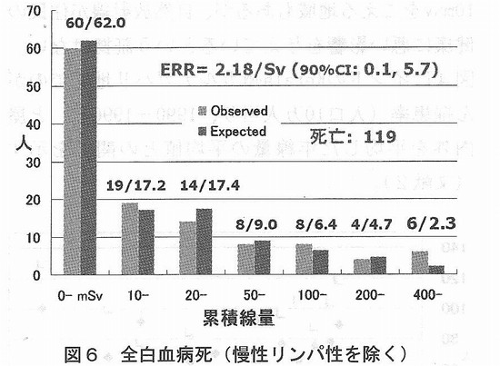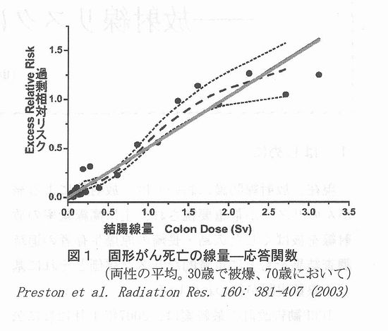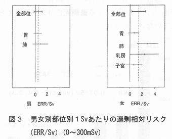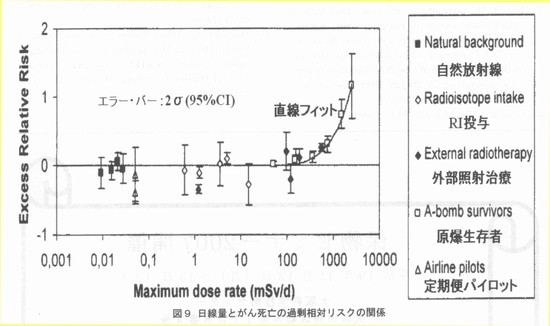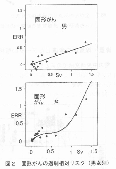 2.3 がんのリスク要因 国立がんセンターのホームページには、次のようながんのリスク要因が挙げられている。 ・食道がん:飲酒、喫煙 ・胃がん:塩分、ヘリコバクター・ピロリ菌感染(?)、喫煙 ・肺がん:喫煙 ・乳がん:早期の初潮、閉経の遅延、高齢での初産、未経度、高身長、肥満、アルコール 3.低線量での発がんリスクを示す疫学研究 3.1 1CRPの主張 ICRP新勧告のベースになるものとして、第1専門委員会のタスクグループの報告書「放射線関連がんリスクの低線量外挿」 (ICRP-99)では、結論として、「LNT理論は、放射線防護の実際的な目的に対して最も慎重(prudent)なリスクモデル」で あり、疫学調査が1 mGyオーダーの被ばくと関連した統計的に有意ながんリスクを示せないからといって、リスクがない(no risk)ということを意味してはいないという。以下のような低線量被ばく研究を引用している。 (1)胎内X線被ばく 数10mGyでの過剰がんリスクには疫学的な直接的証拠があり、15歳までの白血病、固形がんで約1.4という相対リスクがい くつかの症例−対照研究で観察されている。 これに対し、「コホート研究では関連がない(広島・長崎の被爆音調査でも)、バイアスの可能性がある、白血病も固形 がんも相対リスクが同じというのはおかしい」との疑問が出されているが、「コホート研究で見つからないからというのは理由にならない。原爆被爆者では把握漏れもあるのではないか」と反論している。 (2)広島・長崎の被爆者調査 調査集団の大部分は、100 mGy未満の被ばくであり、約120 mGy未満の被爆音に限定して解析するとGyあたりの過剰相対リスク(ERR)は、0.74(90%CI 0.1-1.5)で、 全線量範囲の評価値(ERR/Gy=0.47)と変わらず、しきい値があるという証拠はないという。これは、図1に示すような男女を平均し、すべての固形がんを合計した解析だけで断言している。 ![]() 3.2 Brenner,R.Dollらの主張 米国科学アカデミー紀要(PNAS Nov. 25,2003,vo1.100,N0.24,13761-13766)に掲載されたD.J.Brenner,R.Do11らの「低線量電離放射線によるがんリスク:現在の知見の評価」と題する論文では、ヒトのがんリスクが上昇するという良好な証拠があるX線、γ線の最低線量は、急性被ぱくで〜10-50mSv、遷延被ぱくで〜50-100mSvであり、さらに低い線量のリスクを評価する最適な方法は直線外挿であるとしている。低線量の急性被ばくの例として、原爆生存者の調査結果を挙げ、固形がん死亡調査では、5〜125mSV(平均34mSV)で有意な増加、また、がん罹患調査では、5〜100mSV(平均29mSV)で有意な増加が認められているとしている。また、X線診断による胎内被ばくでは、10mSVで有意な定量できる小児がんリスクが得られているとしている。低線量の遷延被ばくについては、原子力従事者の白血病、子どもの頭皮照射による甲状腺がんなど、統計的に有意なリスク上昇が見られたという研究結果のみを挙げている。 4.低線量での発がんリスクの吟味 4.1 原爆被爆者調査結果の詳細検討 2005年6月末に発表された米国科学アカデミーのBEIRZPhase 2委員会の報告書“Health Risks from Exposure to Low Levels of lonizing Radiation”に関して、米国エネルギー省のR.L.0Rbach科学局長は、米国科学アカデミーのR.J.Cicerone 会長宛に7月15目付で書簡を送り、広島・長崎のデータの公表された解析のみを用いて、LNT仮説の使用を再度是認したことに科学界の多くが懸念を表明している、と批判している。 水野正一博士(東京都老人総合研究所)は、図1と同じ原爆被爆者調査(LSS第13報)のデータを用いて、男女別に固形がんの過剰相対リスク(ERR)の解析を行っている(私信、2004年)。図2に示すようにERRは男女で非常に異なっている。 ![]() また、300mSV以下に限定して解析した結果は、図3に示すように男性では発がんリスクは認められず、女性では肺がんと乳がんのリスクが大きいことがわかる。肺がんや乳がんについては、喫煙率あるいは結婚、出産などの要因に影響されるため、これらの要因の被爆群による相違を考慮することなしに放射線の影響を論ずることはできない。 ![]() 4.2 スウェーデンの小児白血病と胎内被ば< スウェーデンで1973年から1989年までの間に生まれ、白血病と診断された子供(652例)の症例−対照研究では、出生前X線検査が白血病のリスクに影響を与えなかった(オッズ比1.11、95%信頼区間0.83-1.47)と報告されている(文献1)。 4.3 高自然放射線地域による調査結果 インドやブラジル、イランなどには1年間に10mSVをこえる地域もあるが、自然放射線が住民の健康に悪い影響を与えているという証拠はない。図4にインドのKerala州カルナガパリ地区でのがん罹患率(人口10万人当り、1990−1996年)と屋内外を平均した年線量の平均値との関係を示す(文献2)。 ![]() 4.4 米国、英国、カナダの原子力従事者 国際がん研究機関(IARC)における3カ国の原子力施設従事者95,673人の疫学調査データの合同解析では、全がんによる過剰死亡リスクは認められていない(図5)。 ![]() 白血病については、線量一応答関係に統計的に有意な傾向を示したとされているが、「放