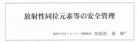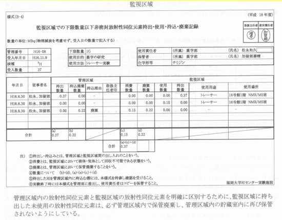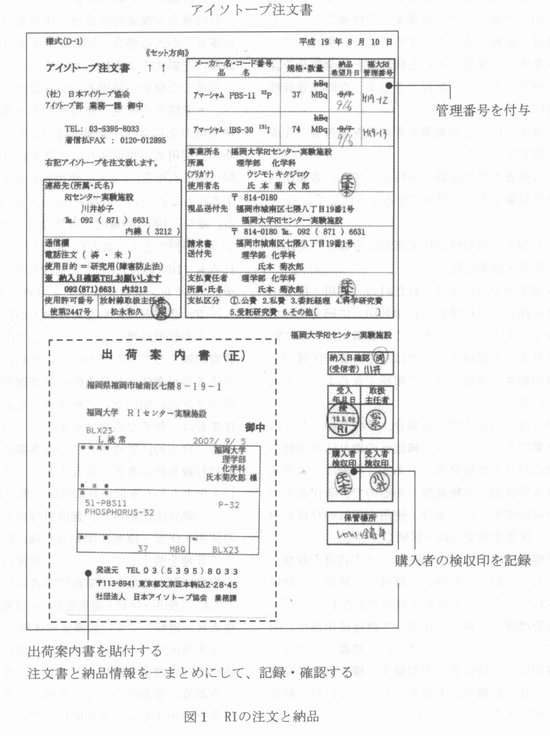 | はじめに 文部科学省から平成17年2月24日付け16科原安第117号「放射線管理状況報告に際しての放射性同位元素等に関する点検及び報告依頼について」の通達が出され、点検の結果、平成17年8月1日までに、管理下にない放射性同位元素等の発見の事例が62事業所より91件報告された。これらの事例の発生原因は、決して特殊なものではなく、どの事業所でも起こり得るものと考えられている。放射線障害防止法では、放射性同位元素等の取扱いは、許可を受けるか届出を提出することにより行うことになっており、さらに、放射性同位元素は所持及び譲渡・譲受が制限されている。許可等を受けるには、放射線施設が一定の基準を満たしていなければならない。安全管理に対する義務は、1)人に対する事項(教育訓練、健康診断、被曝線量の測定)、2)場所に関する事項(管理区域の設定、放射線の量及び汚染の状況の測定)、3)行為に関する事項(使用、保管、廃棄、運搬についての基準の遵守)に分けられる。記帳の義務に、受入れ・払出し・使用・保管・運搬・廃棄等がある。放射性同位元素の受入れ・保管・使用・廃棄・払出し・運搬・持出し、持込み等に関する記帳・記録は、放射性同位元素使用の流れを管理する過程で、最も重要視されるべき帳簿である。 今回、放射性同位元素の受入れから廃棄までの記帳・記録に関して、非密封線源を使用している他施設の参考になればと思い、本事業所で行っている放射性同位元素等の安全管理について紹介する。 (1)放射性同位元素の受入れ 放射線業務従事者(使用者)が放射性同位元素(RI)を注文する場合、「アイソトープ注文書」に必要事項を記入して注文するように統一している。原本は管理室で保管し、そのコピーを発注者に渡している。また、受入れ年月日順に本事業所独自の「RI管理番号」を付与して記録している。発注と納品の確認として、RI受入れは、注文書に、図1に示すように、「出荷案内書」を貼付・確認する。 「出荷案内書」は、運搬・郵送されてきた納品物にしか存在しないので、納品物名、数量を照合する最もよい方法である。実際には、シール状のものが多く、貼付するにも便利である。 RIの注文が1個以上の場合、裏に貼付している。納品物を確認するには、発注者本人が確認するのが最善であるので、本事業所では、「事業所の検収印(年月日)」、「受取者の確認印」だけでなく、「発注者本人の検収印」を記録する欄を設けている。受取者と発注者本人が二重に確認を行えば、注文した品と納品物が一致している確たる証拠となる。 以上のように、注文書原本と出荷案内書を利用した納品書を一つの書類にまとめておけば、事業所内にRIを受け入れるまでの経緯や注文物と納品物の内容が整合している信頼性高い帳簿となる。福岡大学RIセンター実験施設は、3年に1度の定期検査、定期確認を受けている。定期確認の際、検査官から「RIの注文書と納品物の一致をどのようにして確認しているか?」との質問を受けた。おそらく次の事例のことがあるからであろうと思われた。その事例は、「ある事業所で、平成13年11月27日に、運送業者が搬入した放射性同位元素 (32P)6個を、管理委託業者が5個と認識して受け入れたところ、送付状の記載から6個であることに、12月4日になり気付いた。紛失した32Pの量は1.67MBqであった。」である。定期確認を受ける以前は、一つ一つ注文書、納品書、保管数量を確認していけば照合・確認できるが、検査官がすぐに照合・理解できる図1に示すような書式に変更した。 ![]() (2)年度毎のRI受入れ数量記録 RIを受け入れた場合、年度毎に年間のRIの受入れを年月日順に記録し、それぞれにRI管理番号を付けて整理している。 (3)核種別の受入れ数量及び廃棄数量記録 受け入れたRIについて、その核種ごとに「受入れ数量と廃棄数量」を整備している。受入れと廃棄があった場合、その数量変化を核種ごとに、その都度、記録する。そうすることで、現時点で、本事業所内に保管している核種ごとの全数量を容易に確認でき、常に把握できるようなRI保管管理体制になる。 年度末には、この帳簿を管理状況報告書の作成にも役立てている。 立入検査や定期確認が何時あっても、事業所内の保管数量をすぐに明示できるようにしている。 (4)個々の放射性同位元素別に分類した使用・保管・廃棄記録 本事業所では、受け人れたRIの「使用・保管・廃棄記録」を「核種別・化学形別」に細分化して記録するようにしている。この帳簿には、単にRIの数量変化を記録するのではなく、管理区域内でのRIの動きの情報を加えて確認できるように工夫している。 例えば、RIを使用する場合、その日のうちにRIを廃棄できないケース(細胞への取り込み実験や動物に投与した場合等)がある。実際に、本事業所は大学機関の実験施設であるので、各作業室でRIが継続使用される場合、使用中のRIの存在を明示し、保管や廃棄記録と区別している。 管理区域内では、どの場所