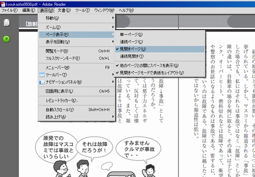 見開き一話の内容ですので、読みやすい方法は@いったん、情報をPCにダウンロードする(ファイルを保存)。A保存したファイルの読み込みをする。B下図のようにPDFファイルが開けましたら、上段の・表示の項目をクリック⇒ページ表示⇒見開きページ・他のページとの間にスペースを表示・見開きモードで表紙をレイアウト・にチェック入れますと、見やすい表示になります。