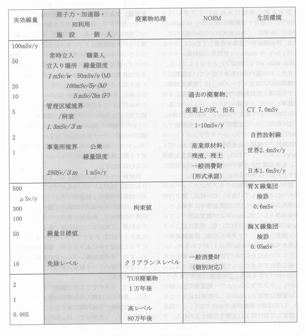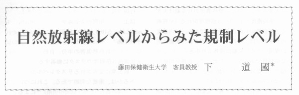 1.はじめに 放射線は宇宙創成時から存在しており、もちろん今も宇宙にくまなく存在している。それゆえ、われわれ人類はおろかすべての生物は放射線のある環境で発生し、進化を遂げてきた。放射線は一面で生物の存在を脅かすものであるが、それがなければ今の人類は存在していないといってもよいだろう、つまり、放射線は生命体の発生と消滅に深くかかわっている。 このような自然放射線によって、地上では一定の線量レベルがある。一方では、技術の進歩にともない原子力・放射線の利用が進展してきたが、それに伴い発生する負の影響としての線量を極力少なくするため、防護に関する線量規制レベルがある、 この小論では、自然放射線レベルと線量規制レベルとの数値的な関連について、若干の比較検討を試みた。 2.自然放射線の線量 自然放射線レベルについては、現時点での知見を要領よくまとめた国連科学委員会報告 1)を利用するのが適切である。内容はよく知られているので、他の資料による情報も併せて以下に簡潔に整理しておく。なお、以下の文中での数値は、その都度丸めて表しているので、単純な加減乗除では合わないことがある。 線量と濃度レベル (1) 自然放射線から受ける年,間の線量は、世界平均値は2.4mSVであり、わが国はおよそその2/3の1.6mSvである 2) (2)環境放射線量の半分(1.2mSv;わが国は更に低く0.5mSv程度)は、主にウランの壊変生成物であるラドンの吸入による内部被曝である。 (3)ラドンの屋内濃度は、国内外を問わず屋外濃度の約3倍である。一般公衆の通常生活では、屋内で過ごす時間が全時間の80%以上と見積もられている。濃度の高いことと存在時間の長いことから、ラドンによる被曝量の90%以上は屋内である。 (4)残りの半分の環境放射線量は、地表面近傍(大地と空中)に由来するγ線(大地放射線)、および宇宙線、さらに食物に由来する放射線(食物放射線)の合計である。大地放射線と宇宙線は外部被曝をもたらし、食物放射線は内部被曝を与える。それらは、それぞれ0.5mSv、0.4mSV、0.3mSV(概略的には1/3程度ずつ)である。 (5)大地放射線をもたらす核種はウラン系列核種、トリウム系列核種およびカリウムである。その他は微量のため線量計算では無視してよい。そのうちの1/3弱(0.1mSV弱)がラドン壊変生成物であるPb-214とBi-214に由来する。これをもたらす土壌のウラン濃度は0.035Bq/g (3)で、これは世界平均値にほぼ等しい値である。 変動幅 - (6)ラドンに関しては、その地域差や時間的変動は大変大きい。特に、屋外濃度の日変動は大きく、平均濃度の1/3〜3倍程度振れる(早朝高く、午後低い)のはごく普通である。屋内濃度の日変動幅は、屋内という閉ざされた状態に近い環境のために変動は屋外より小さく、1/2〜2倍程度である 2)。したがって、世界平均値の幅の下の値は大まかには0.6mSvであり、わが国では0.25mSvとみておけばよい。 (7)一方、地表近傍のγ線の変動は、わが国の地域差は2倍程度の幅があり(関東地方は中国地方の約半分)、時間変動は大気中ラドンの変動に原因しており、およそ5〜10%である瓢ただし、降雪雨により、短時間ではあるが数倍になることもある瓢通常では、自然変動幅として、地域差に由来する数十%をみておけばよい。 (8)宇宙線による線量の幅は緯度による差(緯度効果)が大きいが、わが国の居住範囲はおよそ北緯24〜46度にあるので、20%程度の違いがある。また、高度による違いは、海岸と海抜1500mの居住では2倍ほど差がある, (9)食品摂取による線量は、国、民族、習慣等々によって大きく異なるが、国内での変動はそれほど大きくないと思われる。 3.リスクレベル リスクレベルについての知見をまとめると次のようになる。 (1)実効線量1mSV/yは、5×10-5/yのリスク係数総合致死リスク係数)に相当する(ICRP)(‰なお、ラドン濃度100Bq/m3は7.2×10-5に相当する。 (2)したがって、10μSV/yは5×10-7/yのリスクに相当し、30μSV/yは15×10-7/yのリスクに相当する。 (3)このリスクをわが国の人口1.3億人当りの年間死亡数で表すと、65人と192人に相当する。 (4)他のリスクと比較する。中谷内一也引こよれば、わが国の10万人当りの年間死亡数(2004年の実数)は、がん:250人、自殺:24人、交通事故:9.0人、火事:1.7人、自然災害:0.1人、飛行機事故:0.013人、落雷:0.002人である. 以上から、年間の実効線量10μSv、304Sv、1mSvにおける10万人当りの年間死亡リスクは、それぞれ0.05人、0.15人、5人と比定される。この値は、それぞれ自然災害の半分、自然災害の1.5倍、火災事故3倍程度のリスクに相当する。 一般公衆に受容されるリスクレベルがどの程度であるかは、重要な問題である。これについて英国学士院の報告(辻本・草間の引用)(8)によると、危険な産業の事故死亡率は(1〜3)×10-4yであり、10-5/yになるとさらにリスクを低減するために費用を投入しようとしないレベルであり、10-6〜10-7/yは敢るに足らないリスクとしている。国情や社会的情勢、対象あるいは価値観などによって変わることが当然考えられ、英国の報