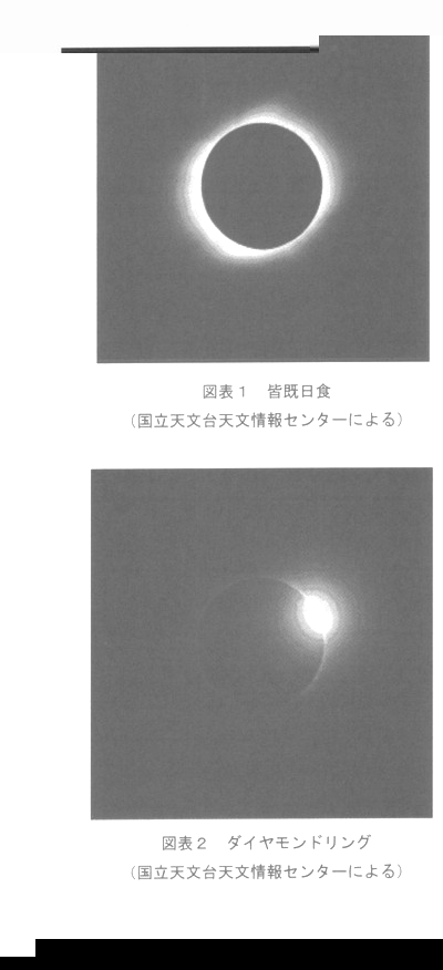 | 1.はじめに 2009年7月3日(金)〜9月23日(水)東京国立近代美術館において「ゴーギャン展」が開催されている。ゴーギャンとは印象派を代表するフランスの画家である(1848〜1903)。彼の代表作に「我々はどこからきたのか、我々は何者か、我々はどこへ行くのか」がある。これは畢生の大作といわれ、遺書代わりに描かれたものである。絵画の価値はわからなくても「我々はどこからきたのか、我々は何者か、我々はどこへ行くのか」の表題については誰もが一度は考えた事と思う。 琵琶湖周辺を旅更や塵を噴出しながら、ゆっくりと消えていく。最後に燃えカスのような白色わい星として残る。 核融合反応は軽い元素が融合してエネルギーを放出するもので、核分裂は重い元素が軽い元素に分裂してエネルギーを放出するものである。現在の原子力発電は核分裂を利用したものであるが、未来の発電として核融合炉が考えられている。 4.銀河系の形成 宇宙は急激に膨張した。その時、宇宙に放出された物質は一様に分布するのではなく濃淡が出来る、その濃淡が銀河である。宇宙誕生から10億年後には星や星が集まった銀河が出来上がった。そして、銀河が10個ほど集まり、銀河群を形成された。さらに銀河群が集まって銀河団を作り、さらに超銀河団を形成する,宇宙はこのように階層構造をしている。この様子を「グレートウオール」(宇宙の万里の長城)とも言われている。物質が衝突・結合する時には必ず回転する。そのため、ガス星は回転している。ガス星が集まった銀河も巨大な「渦」を巻きながらその中心部へと引き込まれていく。われわれの銀河系(天の川銀河)には2000〜2500億個の星があるといわれている。銀河系を横から見ると円盤状になっており、円盤の中心(銀河中心)の周囲を沢山の星が回っている。これらの星は回転しながら最後には銀河中心に引き込まれていく。銀河系の周囲を回っている星の―つが太陽である。太陽もいずれは銀河中心に引き込まれていくであろう。 太陽は一度爆発し、周辺に散らばった星の塵が再度衝突を繰り返しながら結合し、現在の太陽ができあがった。太陽の大部分は水素で出来ており、その水素がヘリウムに変換(核融合反応)した時にエネルギーを放出する。現在は水素の半分ぐらいがヘリウムに変換されている。太陽の周りを太陽に近いほうから水星、金星、地球、火星、木星、土星、天王星、海王星の8個の惑星が回っている。昔は冥王星も惑星の一つであったが、質量が小さすぎるという事から、2006年8月24日に国際天文学連合(IAU)が準惑星に分類した。 これら惑星の外側を水・一酸化炭素・二酸化炭素・メタンなどの氷を主成分とするオールトの雲が球殼状に取り巻いている。地球も太陽の周りを回っている惑星に一つである。太陽も死を迎えるときは膨張を始める。丁度、太陽の周囲を回っている地球の近くまで膨張する。勿論、そのときには生命は全滅していると思われる。 5.月の誕生 46億年前、宇宙空間に飛び散った原子やガスが集まって、地球が誕生した。誕生して間もない頃、星の塊が地球に衝突した。その時に破壊された星の塊残骸と衝突によってえぐりとられた地球の表層物質が再度集まって固まり、月が出来たと言われている。地球から分離したばかりの月は地球の近傍を回っていた。そのため、月が地球に与える影響が非常に大きい。地球上に生命が誕生したのも月の影響といわれている。生命の誕生については次号で述べることにして、最近、見る事の出来たロマンチックな皆既日食の話を付け加える。 太陽の直径は月の約400倍あるが、地球からの距離も月の400倍遠く離れているので、地球から見た場合、月が太陽を完全に覆い隠す時がある。このときは太陽の光は地球に届かない。しかし、太陽の周りのコロナがリング状に輝いて見える。これを皆既日食という。しかし、月の地球周回軌道及び地球の公転軌道は楕円であるため、地球から見た太陽と月の視直径は常に一定ではない。そのため条件が整はなければ皆既日食は見ることが出来ない。今回、日本では46年ぶりに皆既日食を見ることが出来るようになったが、日本の各地では曇りや雨の空模様であった。しかし、7月22日10時10分〜12時49分硫黄島近間海の船上できれいな皆既日食が観察された。その時の写真を図表1に示す。太陽がすべて隠れる直前と直後に太陽の光が一ケ所だけ漏れ出て輝く瞬間がある。これをダイヤモンドリングといわれている,この時の写真を図表2に示す。しかし、月が太陽をすっぽりと隠すことが出来なく、太陽の外周が月の外側にはみ出て見える場合がある。このときを金環日食という。 宇宙は「無」より出来た。そして、大爆発を起こし、今なお膨張を続けている。このインフレーションはいつまで続くのであろうか。バブルの崩壊はないのであろうか。バプルが崩壊した場合、膨張が収縮に転じて、もとの無に転じてしまう、これをビッグクランチという。壮大な宇宙の中に