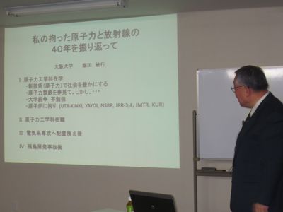 | 平成26年度第2回講演会 日 時 : 平成27年3月23日(月) 場 所 : サンエイビル3階 講習室 テーマ :「原子力と放射線を振り返って40年」 講 師 : 飯田 敏行 氏 (大阪大学大学院 教授) |